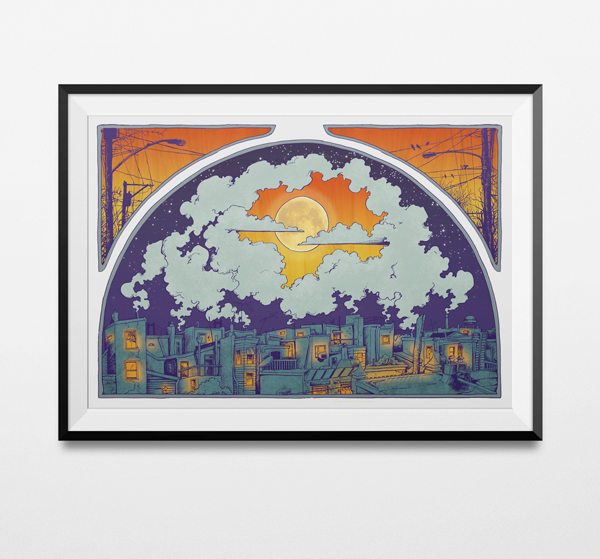 I created this piece reflecting upon city life. I wanted to create something that was dark, yet uplifting. Here we have a neighborhood in Philadelphia were everyone has sequestered themselves within the confines of their own homes. However, the smoke clouds rising from each household combines together to give the feeling and hope that common dreams and ideas are shared.